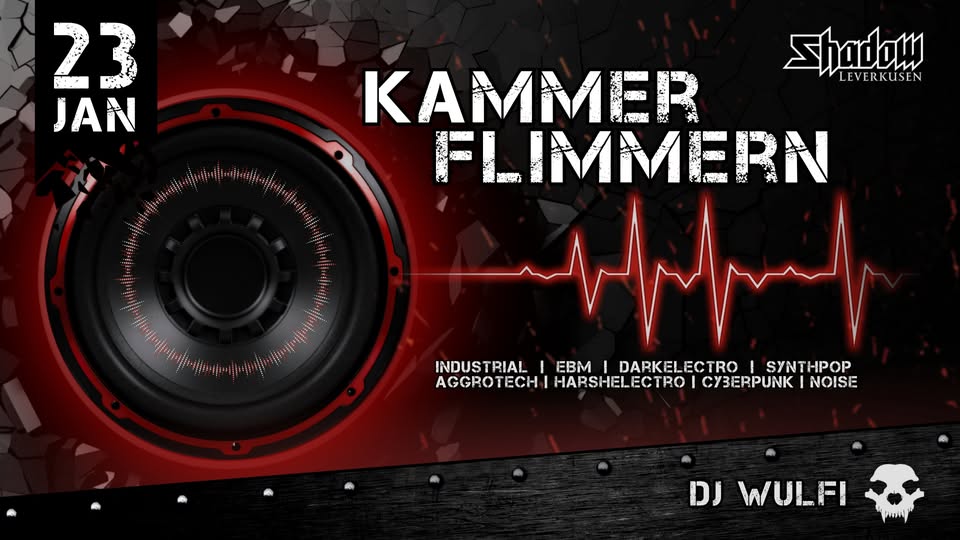 Dark Electro | Industrial | EBM | Aggrotech | Harsh und Cyber Electro | Cyberpunk | Noise Willkommen zur Kammerflimmern! Erhöhte Beatfrequenz. Symptome: Unkontrollierter Tanzreiz.Rhythmisches Basswummern. Behandlung: Oldschool trifft auf aktuelle Beats, düster, treibend, kompromisslos.