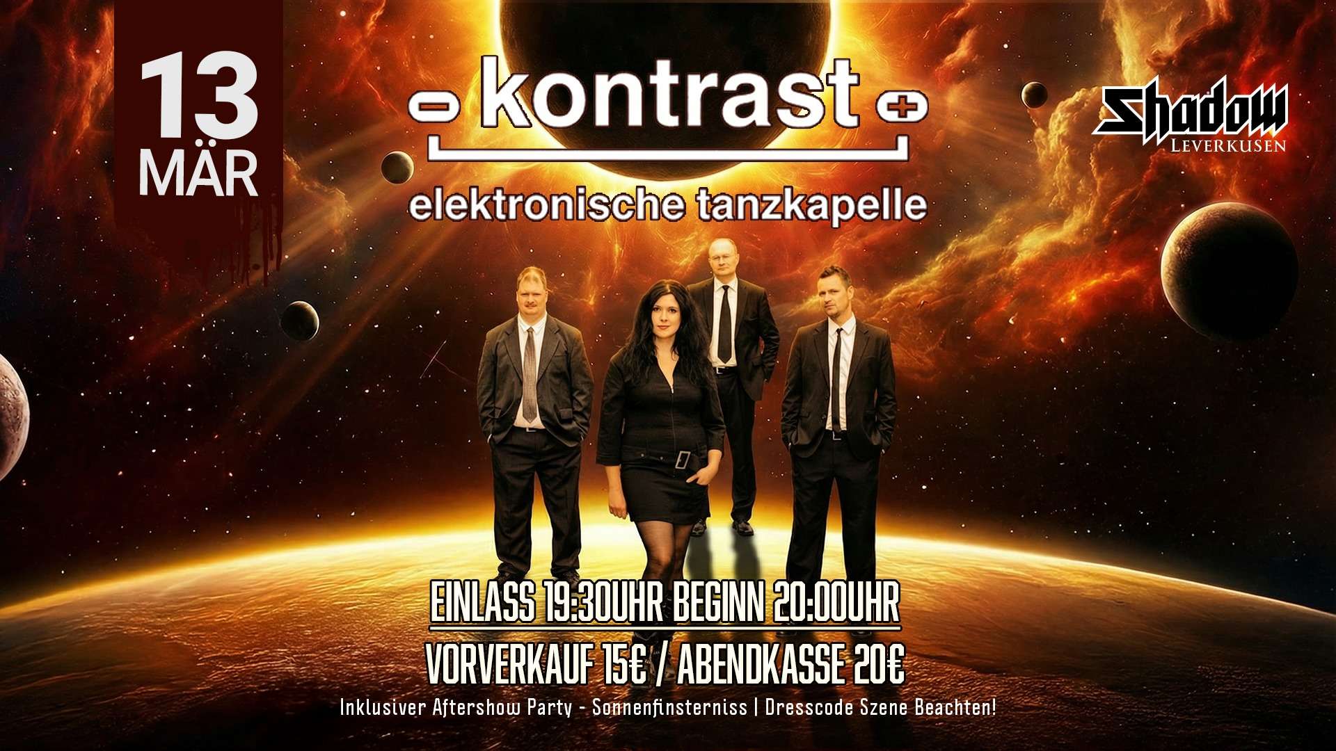 Sonnenfinsternis ist mehr als eine Party. Es ist eine Nacht, die euch in die finsteren und zugleich romantischen Sphären dunkler Musik entführt. Pulsierende Rhythmen treffen auf melancholische Melodien, getragen von einer Stimmung, die unter die Haut geht und euch bis in die frühen Stunden gefangen hält.